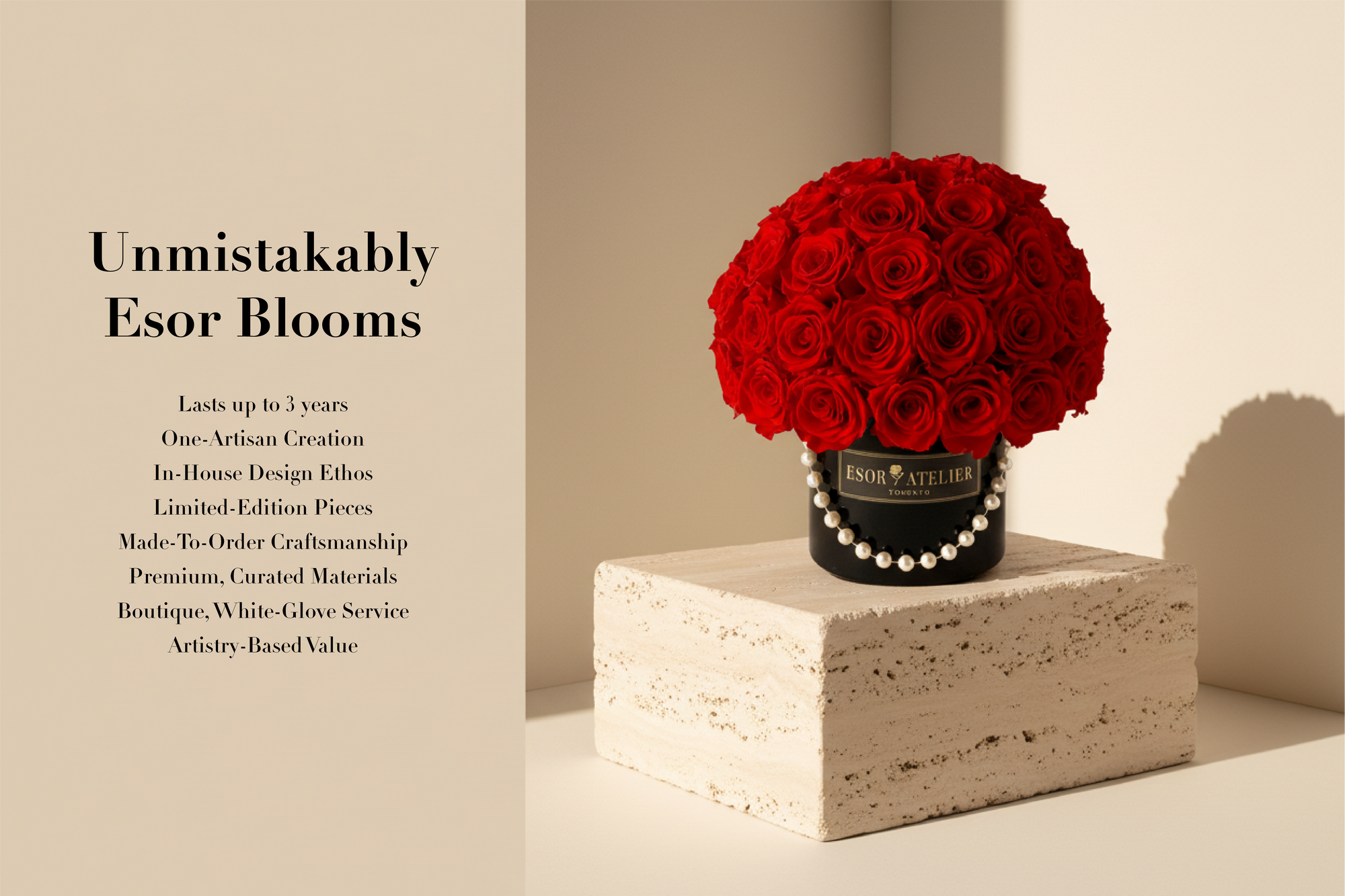Real fresh florals are refined through an advanced, plant‑based preservation process that maintains their softness, form, and colour for up to 3 years — a signature expression of the Esor Atelier aesthetic.