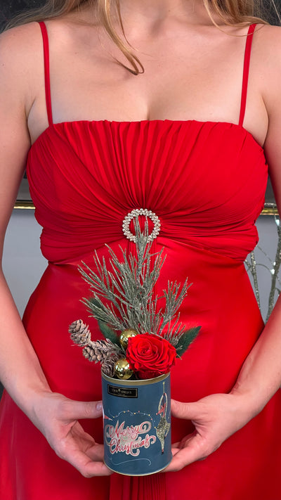 Eugene is beautiful Xmas floral arrangement contains One Esor Eternal rose that last 1-3 years. Eugene floral arrangement is complemented with preserved green moss and preserved bunny tails along with artificial greenery and gold accents. Eugene makes a perfect gift for your loved ones this holiday season.