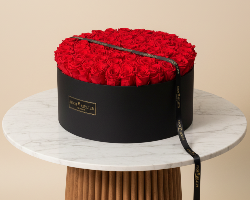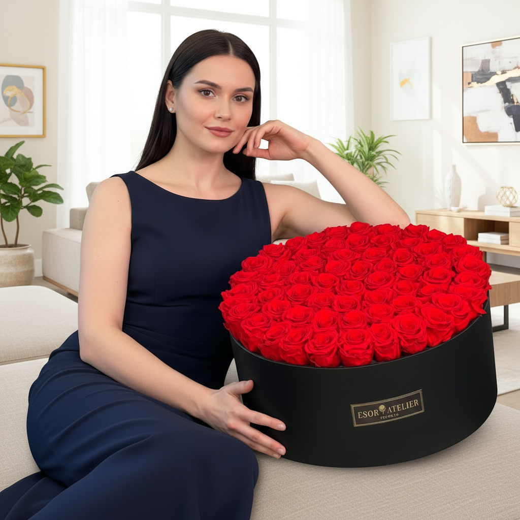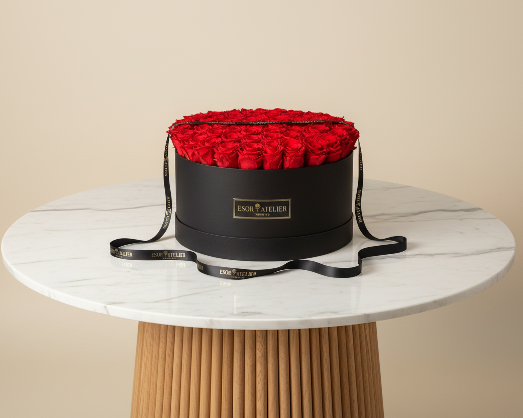 Layla is a beautiful Hat Box containing Esor eternal roses (real roses that have been preserved to last 1-3 years) handcrafted in Toronto by our floral artisans. It comes in 2 sizes (Grand and Petite)