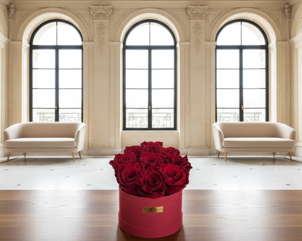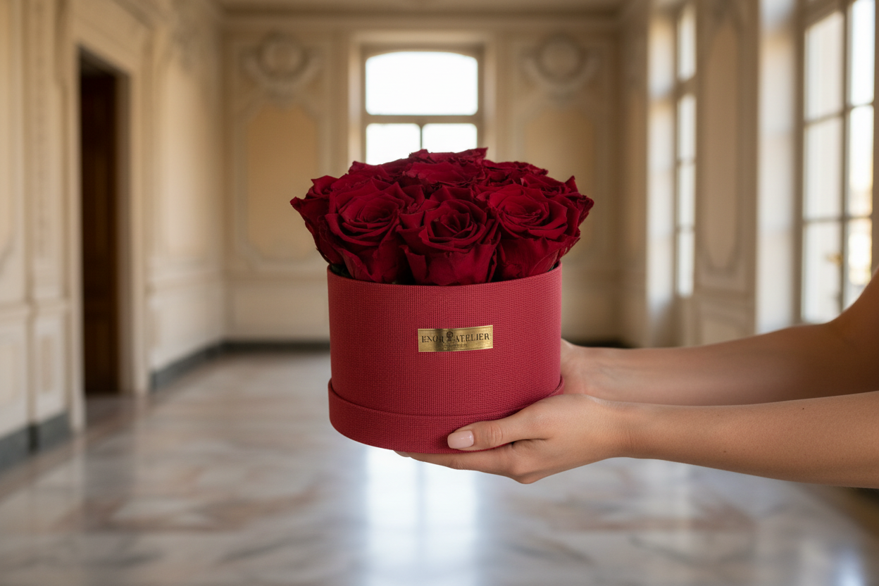 Introducing our charming Hat Box Agatha with 8-10 preserved roses – a delightful blend of elegance and longevity. Each rose is expertly preserved, ensuring its beauty lasts up to 3 years. This petite yet impactful arrangement makes for a perfect token of affection, fitting for any occasion. The sleek hat box design adds a touch of sophistication, making it an ideal gift or a stylish addition to your home decor. Embrace the enduring beauty of our Hat Box with Preserved Roses and convey your sentiments with a timeless touch.