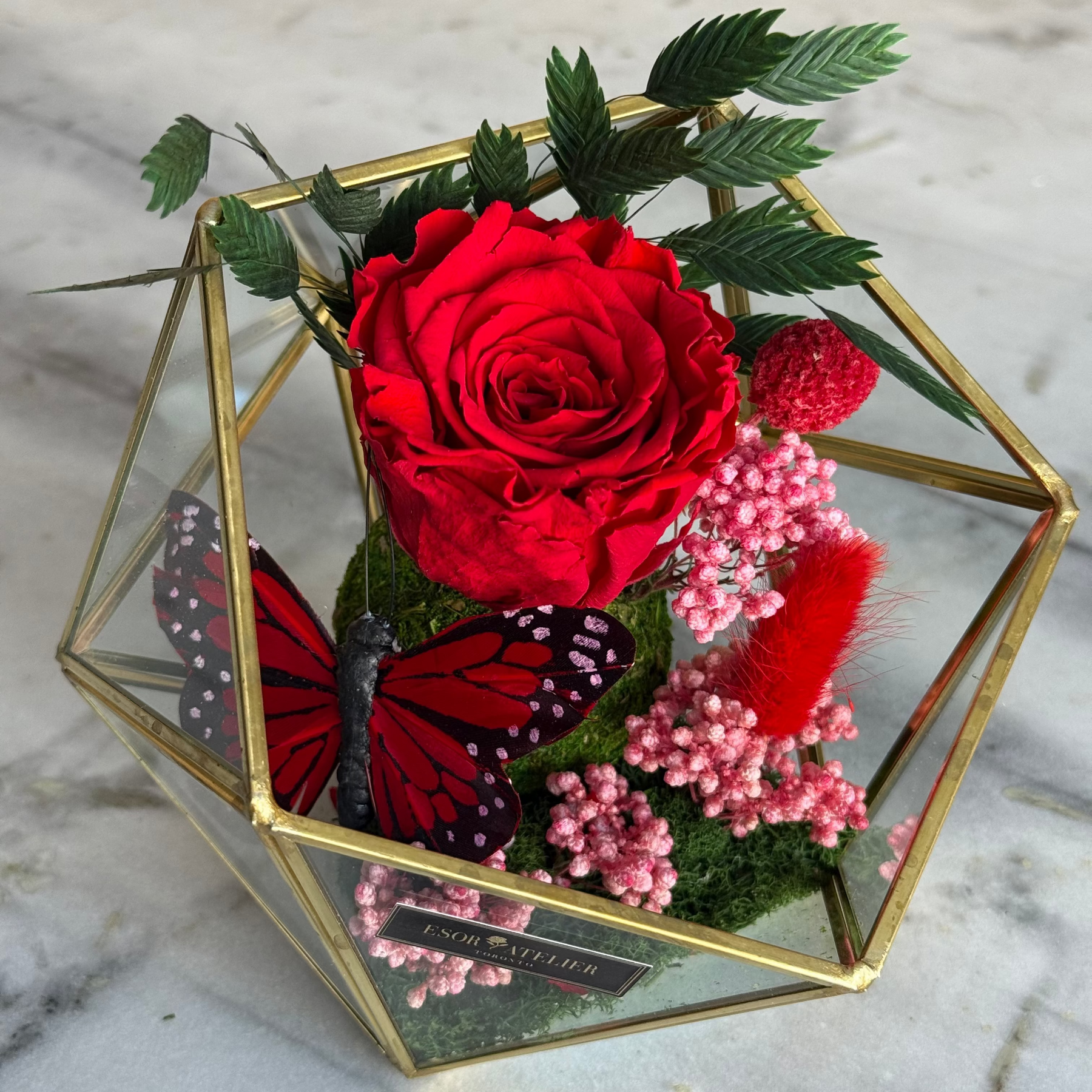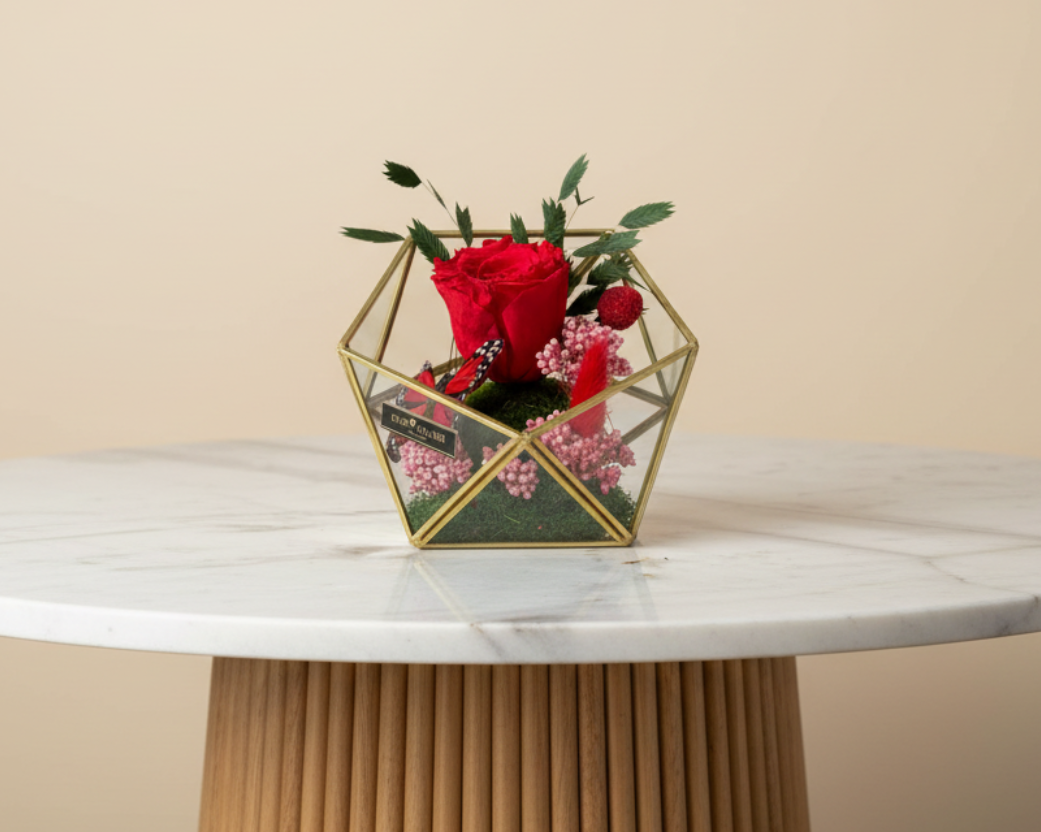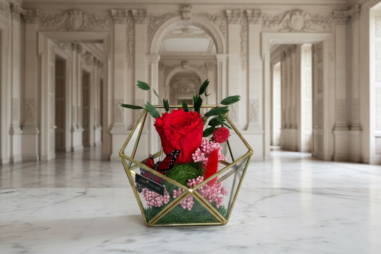 The Reagan arrangement is a contemporary floral keepsake designed with clean lines and timeless charm. Encased in a striking geometric glass terrarium, this piece showcases one preserved rose surrounded by a curated selection of other preserved florals and greenery, creating a balanced and elegant composition.