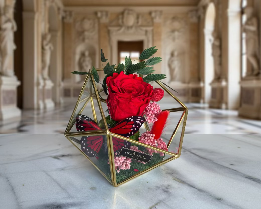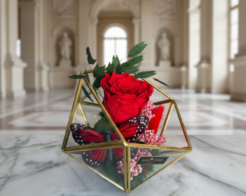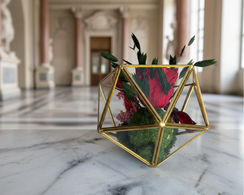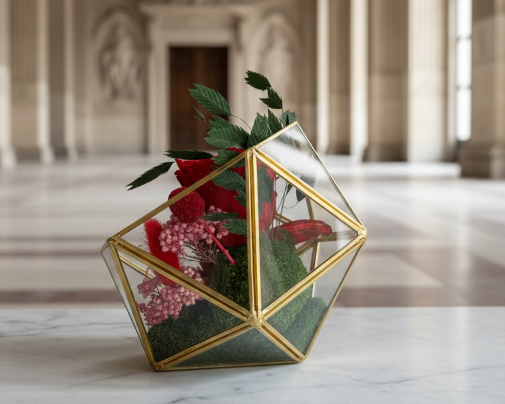 The Reagan arrangement is a contemporary floral keepsake designed with clean lines and timeless charm. Encased in a striking geometric glass terrarium, this piece showcases one preserved rose surrounded by a curated selection of other preserved florals and greenery, creating a balanced and elegant composition.