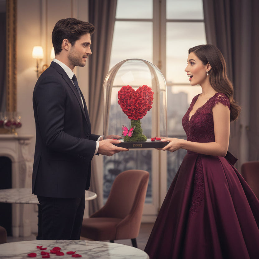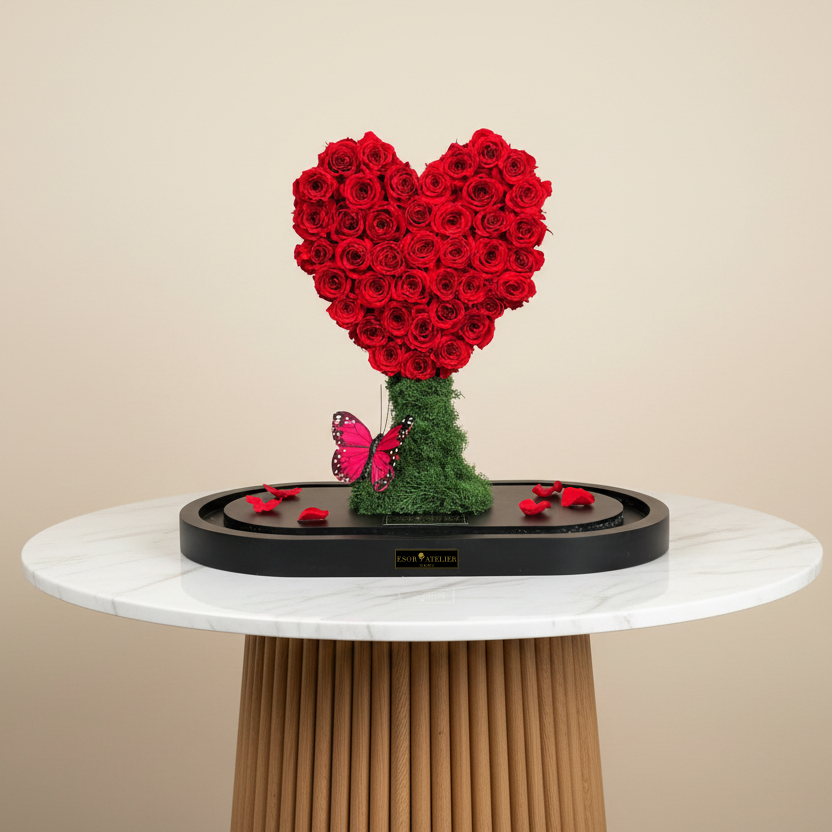 Embrace the language of love with our Heart-Shaped Preserved Rose Arrangement, where passion meets timeless elegance, and love is placed on a pedestal of enduring significance.